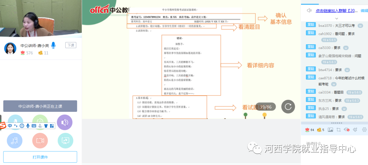 本次培训是就业指导中心落实学校2020年就业工作推进会精神,依托中公教育优质教学资源,邀请中公教育教师研究院各模块资深讲师进行在线直播培训,帮助我校学生在疫情期间备考教师资格证,力争提高学生参加全国教师资格考试的通过率。